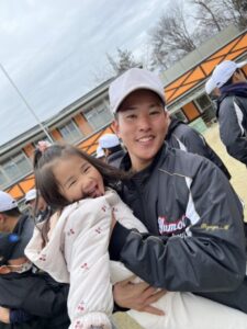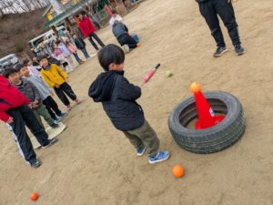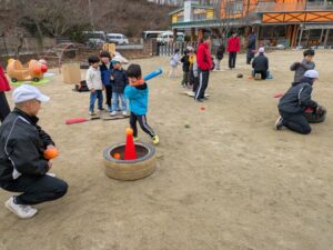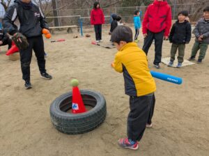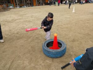 お兄さんにバットの持ち方を教えてもらい、ボールを打ってみたりと楽しく